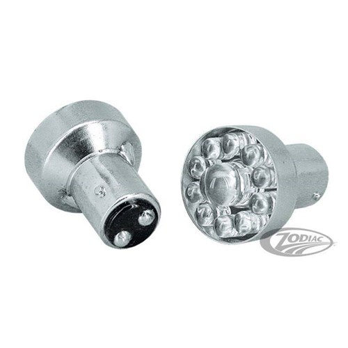 Bright shining 12 Volt LED replacement bulbs. Available in Bright Red that can be used to replace almost any taillight or running light bulb and Bright Amber that can be used to replace turn signal light bulbs. Also available with Clear LED's. Bulbs have a thick socket (BA15) and give a very special light effect. LED lights use only a fraction of the power normal bulbs do. Red, Amber and Clear bulbs are available in Single or Dual filament.