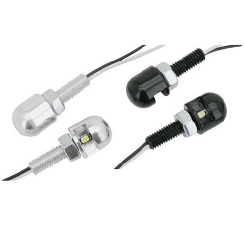 These very small license plate lights incorporate a white bright shining LED light. They are just 1/2" (12.7mm) in diameter and 5/8" (16mm) long. Lights feature a 5/8" long 1/4 UNC stud and come with a nut.