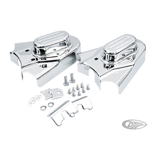 A sleek, streamlined set of diecast covers that blend perfectly with the clean lines of the Softail frame and conceal the unsightly axle nut and adjusters. Covers are brightly chrome plated and install in minutes. Sold in pairs for left and right side.