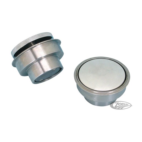 These "Pop-Up" gas caps allow you to give your gas tank that real Custom Smooth Top look, as seen by the world’s leading Custom Bike Builders. They are easy to open or close, just push in the cap, twist and the cap will pop up and is ready to unscrew. No matter if you have a steel or aluminum gas tank, Zodiac has these. Caps are vented, natural aluminum to apply the finish of your choice. Bungs have a 2 5/16" (59mm) outer diameter, caps are 55mm in diameter.
